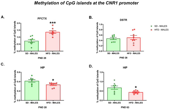 Effects of a maternal HFD during pregnancy and lactation on the methylation of CpG islands at the Cnr1 promoter in the (A) PFCTX, (B) DSTR, and (C) HIP of adolescent offspring and in the (D) HIP of young adult offspring. DSTR—dorsal striatum; HFD—high-fat diet; HIP—hippocampus; PFCTX—prefrontal cortex; PND—postnatal day; SD—standard diet. Data are presented as the mean ± SEM with individual value plots. N = 8 rats/group. * p < 0.05; *** p < 0.001 vs. SD.
