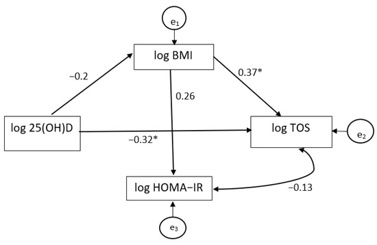 Path model for the effect of serum 25(OH)D concentrations on BMI and TOS (log-transformed variables) in overweight/obese patients with T2DM. Single-headed arrows indicate direct effect/relationships (effect size being represented by standardized path coefficients) while double-headed arrows indicate linear correlations; * p < 0.05: significant standardized path.