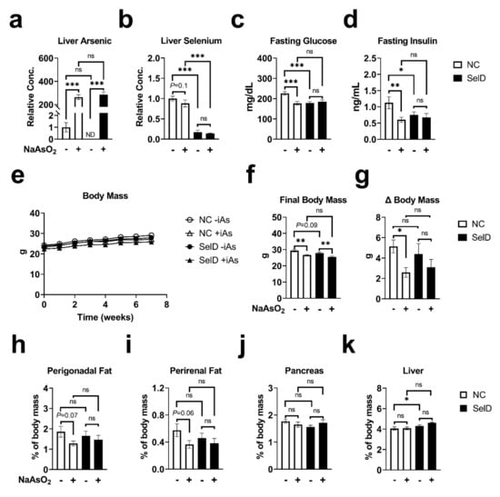 Effects of arsenic exposure and/or selenium deficiency on metabolic and organ mass characteristics. (a) Liver arsenic concentration normalized to controls (n = 4–14); (b) liver selenium concentration normalized to controls (n = 4–14); (c) fasting blood glucose (n = 11–14); (d) fasting plasma insulin (n = 10–12); Weekly body mass (n = 11–15); (f) final body mass (n = 10–13); (g) change in body mass (n = 10–13); (h) perigonadal fat mass (n = 11–14); (i) perirenal fat mass (n = 11–14); (j) pancreas mass (n = 10–14); (k) liver mass (n = 10–14). Data were combined from three independent cohorts. Statistics: All data were log-transformed for statistical analysis. (a–d,f–k) ANCOVA was performed to test for main effects and interactions. (e) Mixed-model ANOVA was used to test overall differences in body mass between groups. * p < 0.05, ** p < 0.01, *** p < 0.001, ns = not significant.