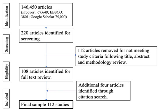 A further four articles outside of the original date range were identified through citation searching and were included due to their relevance to the research question, bringing the total to 112. Figure 1 outlines the PRISMA flowchart for the selection of studies.
