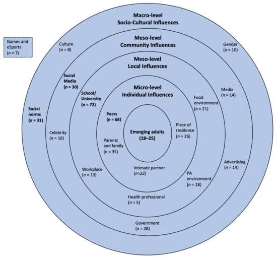 Influences at other levels of the BEM had ties to individual influences, most often peers, indicating that bi-directional influences are in operation. For example, EAs identified that societal expectations often cause them to eat unhealthily in certain social situations or to feel pressure/expectations to act a certain way (in relation to eating and exercise) [44,45]. It was not discernible whether influences were the result of societal mores or direct influence from peers. The disruption to work, study, and living situations exposes EAs to new physical activity and food environments (i.e., meso-level influences) [59]. However, whether an EA chooses a healthy or an unhealthy option is a complex interplay between access, proximity, cost, and individual influences. For example, connection with sporting groups (local level influence) acts as a protective measure that keeps EAs active and engaged with sport [72,82]. However, group participation can also have negative outcomes on EAs through higher levels of binge-drinking (peer influence) and the advertising, sponsorship, and availability of unhealthy foods at sports facilities (local and community influences) [83]. This interplay highlights that while understanding individual influences is important, working with the full ecology of health behaviour through tools such as the BEM may give greater insights that can support future research and intervention design.