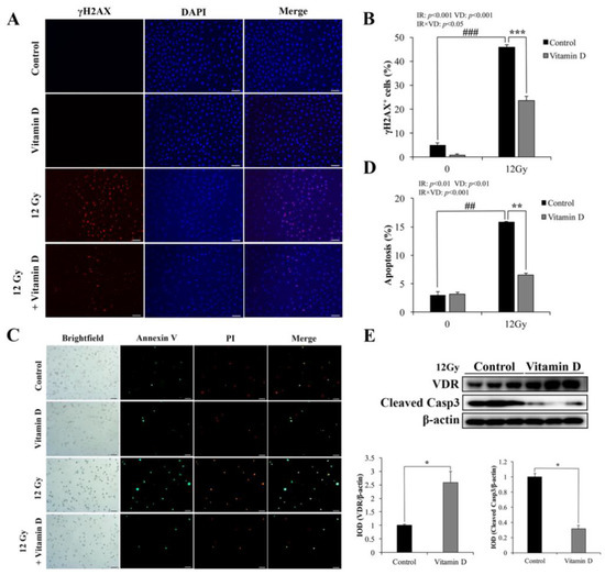 γH2AX is a biomarker of cellular radiosensitivity and DNA damage [28]. Non-IR cells showed a weak positive signal, whereas the γH2AX-positive cells were significantly increased at 1 h after 12 Gy IR (Figure 1A). VD treatment significantly reduced the γH2AX-positive cells after IR (Figure 1A,B). The proportion of Annexin V-positive cells was very small in non-IR IEC-6 cells, and VD treatment did not affect cell apoptosis (Figure 1C,D).