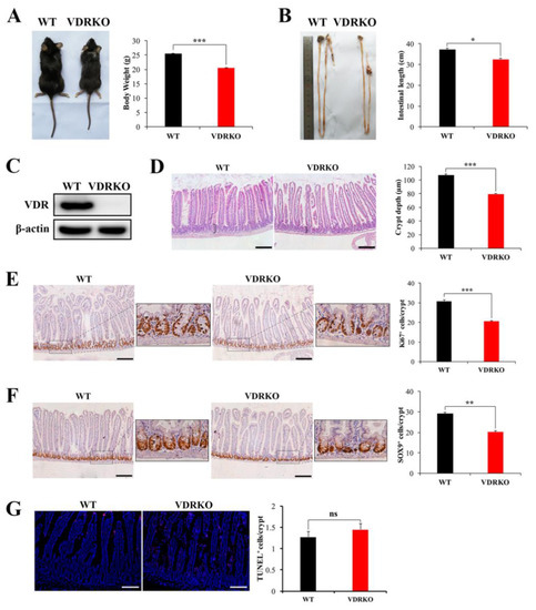 Hypothesizing that VDR upregulation may inhibit IR-induced intestinal damage, we generated a loss of function model of VDRKO mouse by breeding of VDR heterozygotes. First, we studied the function of VDR in the intestine under physiological condition. The body weights and intestinal lengths of VDRKO mice were smaller than WT mice (Figure 3A,B). The VDR expression could not be detected in intestines of VDRKO mice by WB (Figure 3C). H&E staining results showed that crypt depth in VDRKO mice was significantly reduced (Figure 3D). Ki67 is a marker of proliferating cells, including intestinal stem cells and progenitor cells [29]. VDR deficiency significantly reduced the Ki67+ cells per crypt (Figure 3E). SOX9 is a marker of intestinal stem/progenitor cells [30]. The SOX9+ cells were markedly decreased in VDRKO mice (Figure 3F). However, VDR knockout had no significant effect on apoptosis as determined by TUNEL staining (Figure 3G). These results indicated that VDR loss impaired intestinal structure and crypt stem/progenitor cell proliferation rather than induced apoptosis under physiological conditions.