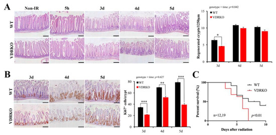 VDR deficiency suppresses intestinal epithelial regeneration and survival time of mice following IR. (A) Representative H&E images of intestine of WT and VDRKO mice at different times of 0, 5 h, 3 d (days), 4 d and 5 d after 12 Gy IR. Quantitative analysis of the number of regenerated crypts/1250 μm at different times after IR. n = 6 in each group. (B) Representative IHC staining of the expression of Ki67 of WT and VDRKO mice and quantification of Ki67+ cells/crypt at different times after IR. n = 6 in each group. Values are means ± SD. * p < 0.05, ** p < 0.01, *** p < 0.001. Scale bar, 200 μm. (C) Kaplan–Meier survival analysis of mice subjected to 12 Gy IR. The statistical analysis was performed by log-rank test. n ≥ 12 in each group.