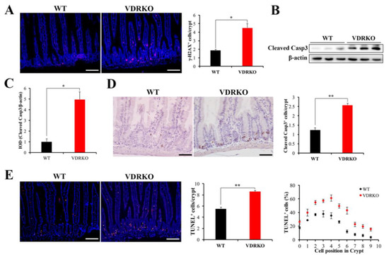 To understand the intestinal injury resulting from VDR deficiency following IR, we investigated apoptotic cells in VDRKO mice. First, we investigated whether VDR deficiency affected DNA damage. The γH2AX+ cells were markedly increased in the crypt cells of VDRKO mice at 5 h post-IR (Figure 5A). In addition, apoptosis was increased in the entire intestine with higher Cleaved Casp3 expression in VDRKO mice (Figure 5B,C). Then, intestinal crypt cell apoptosis was detected, which is closely related to IR-induced intestinal injury [20]. The Cleaved Casp3+ cells in crypts were increased in VDRKO mice compared with WT mice (Figure 5D). TUNEL staining results showed that VDR deficiency significantly increased apoptosis in the crypts at 5 h post-IR (Figure 5E). Quantification of apoptotic cell position analysis revealed that occurrence of apoptosis was more frequent at the cell positions 2–4. However, the number of TUNEL+ cells was increased by more than 50% in VDRKO mice at the cell positions 3–6 compared with WT mice (Figure 5E). These results demonstrated that VDR was crucial to resist IR-induced crypt stem/progenitor cell apoptosis.