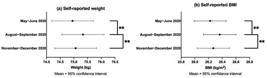 Means and 95% confidence intervals with pairwise comparisons between baseline (May–June 2020), 3-months (August–September 2020) and 6-months follow-up (November–December 2020) for (a) weight and (b) BMI. ** Denotes pairwise comparisons between timepoints were significant at the 0.005 level.