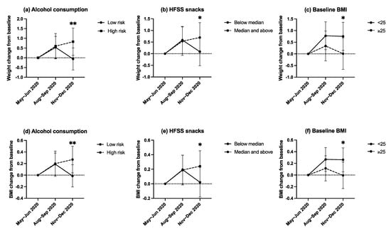 Graphical representations of the time-varying associations of alcohol consumption (a), HFSS snacks intake (b) and baseline BMI (c) with weight change at 3-months (August–September 2020) and 6-months follow-up (November–December 2020). Graphical representations of the time-varying associations of alcohol consumption (d), HFSS snacks intake (e) and baseline BMI (f) with BMI change at 3-months (August–September 2020) and 6-months follow-up (November–December 2020). * Denotes pairwise comparisons between categories were significant at the 0.05 level. ** Denotes pairwise comparisons between categories were significant at the 0.005 level. Median HFSS snacks intake was 34.5 and 40.0 portions per month at 3-months (August–September 2020) and 6-months follow-up (November–December 2020), respectively.