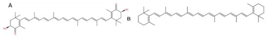 Chemical structure of ASX (A) and β-carotene (B) (created with KingDraw http://www.kingdraw.cn/en/index.html , accessed on 2 February 2021).