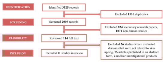 A study was included if it met all of the following inclusion criteria: (1) published paper had full length and was in a peer-reviewed source (2) it was conducted in human subjects; (3) it evaluated skin ageing, including skin parameters and biomarkers related to mechanisms; (4) the investigational product must contain ASX; (5) it involved either oral, topical or combinational ASX applications; (6) it provided available qualitative and/or quantitative data on skin ageing before and after treatments. A study was excluded if it met one or more of the following exclusion criteria: (1) published paper was in a non-peer-reviewed source (i.e., website, magazines); (2) it was in the abstract form; (3) it was an animal study or a cell line study; (4) the investigational product contained additional bioactive agents which exerted the major benefits rather than ASX or did not contain ASX; (5) it was secondary research (i.e., narrative review, systemic review, meta-analysis, notes and conferences etc.); (6) it investigated diseases which were not related to aged skin; (7) it was a duplicate publication. Although the secondary research papers were excluded, the relevant articles in bibliographies of these publications were manually identified for additional information.