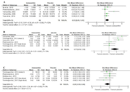 Participants in the study by Yamashita et al. (2002) [28] were supplemented with low a dose (2 mg/d) of ASX and 40 mg/d of tocotrienol for a short term (four weeks), with the best effect size of 2.11 (95% CI = 0.81, 3.40) as compared to other studies which applied higher dosage of ASX (4 mg/d) and the study by Yoon et al. (2014) [9] which used 2 mg/d ASX and 3 g/d collagen hydrolysate for a relatively long time. The collagen hydrolysate has a relatively low antioxidative activity as oxidative biomarkers, thymine dimers and 8-OHdG levels did not significantly differ between groups after UV-irradiation [9]. However, the tocotrienol has antioxidative action 40 to 60 times stronger than tocopherol by scavenging peroxyl radicals [41] and ASX is 100 to 1000 times higher than tocopherol via quenching singlet oxygen [28]. These combinations could exert a synergistic action due to different modes of action. Although tocotrienol was found in rice bran oil which was used by Phetcharat et al. (2015) [32] in ASX oil formulations, the higher dosage of tocotrienol in Yamashita et al. (2002) [28] might contribute to the better effects. Both might be responsible for the moderate heterogeneity within this group. Moreover, the study by Ito et al. (2018) [33] administrated to subjects 4 mg/d of ASX obtained by supercritical CO2 extraction technology, which achieved an improved absorbability of ASX in the subjects. They achieved a relatively high effect size of 0.62 (95% CI = −0.24, 1.48) on restoring UV-induced decrease of moisture compared to similar studies using oil formulations of ASX. Thus, it appears that the supercritical CO2 extraction technology might strengthen the efficacy of ASX and could be assumed as source of heterogeneity. Therefore, future studies might be recommended to apply these technologies to process ASX which could magnify the effect of ASX in humans for more sound quantitative values. The effect size of −0.22 (95% CI = −0.07, 0.67) in the Phetcharat et al. (2015) [32] study might be attributable to the placebo group, as rosehip powder had similar protective effects to restore skin moisture as ASX, contributing to the moderate heterogeneity.