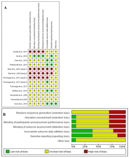 Moreover, randomized double-blinded and single-blinded controlled studies selected in this review were confined by poorly reported study design, leading to the unclear RoB at nearly all domain levels. Further, albeit SDs for changes from baseline in RCTs were not reported in some studies, the attrition and reporting bias was reduced to low levels in several RCTs [9,32,35] by prespecified statistical analysis and formula (See Section 2.4).