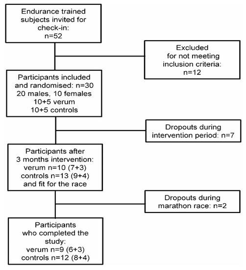 After contacting and advertising the study protocol to regional sports clubs, 30 out of 52 applicants met the criteria for randomisation (defined as experienced endurance runners) to either a verum (V; n = 15, 10 males, 5 females) or a control group (C; n = 15, 10 males, 5 females). Participants had to fulfil the following inclusion criteria: to be clinically healthy endurance-trained adults, aged between 18–60 years, and a body mass index (BMI) between 18–25 kg/m2. Additional inclusion criteria were: constant roadwork training (ca. 3 times per week of 25–30 km endurance training), non-use of other nutritional or ergogenic supplements, no blood lipid- or glucose-lowering therapy within the preceding 12 months, being non-smoker, alcohol consumption <40 g/d, and a relative maximal oxygen consumption (VO2max) between 45–65 mL/kg/min. The study protocol was registered and approved by the Ethical Commission of the University of Freiburg (reg. no. 231/12). The study was conducted in accordance with the ethical standards established in the 1964 Declaration of Helsinki and its later amendments [12]. All participants were informed verbally and supported by a written participant information sheet, and signed consent to participate in the study was obtained.