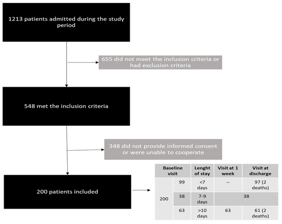 A total of 200 patients who met the inclusion criteria during the study period and agreed to participate were recruited for the study. Figure 1 shows the patient selection process. Of the 200 patients included, 99 had a hospital length of stay of less than 7 days, so the visit considered was at the time of discharge. Thirty-eight had a length of stay between 7 and 9 days, so the visit of the week was also considered the discharge. Finally, 63 patients had a stay of more than 10 days and had one visit at one week and another at discharge (Figure 1). The most frequent reasons for admission were cardiorespiratory (36.5%), digestive (19%), nephrological (9.5%), and oncological diseases (4.5%). Fifty percent of the patients were male, and the median age was 76.0 years (IQR = 20.9). The median CCI was 4 (IQR = 4), and 68% of the patients had a CCI > 3, which is considered indicative of high comorbidity. A total of 18.1% of the patients had moderate disability, and 8% had severe disability according to the Katz index. Nothing per mouth was prescribed for 16% of the patients, a normal or soft/easy-to-chew diet to 80%, and 4% of the patients received a blended diet; only three patients received oral nutritional supplements. The median intake amounts were 30.8 (9.8) Kcal/kg of real body weight and 1.23 (0.44) g/kg of protein for those with a normal diet and 30.2 (16.3) Kcal/kg of real weight and 1.16 (0.68) g/kg of protein for those who had the blended diet. Table 1 shows the baseline clinical characteristics, blood samples data, and body composition data of the patients at admission according to gender.
