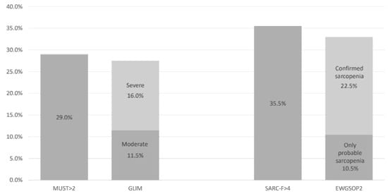 Screening and diagnosis of disease-related malnutrition and sarcopenia at admission. The phenotypic criterion in the GLIM consensus defined the severity of malnutrition, according to the cut-off points [1]. For sarcopenia diagnosed by EWGSOP2, low muscle function implies probable sarcopenia and low muscle mass confirmed sarcopenia [2]. MUST = malnutrition universal screening tool; a score > 2 indicates high risk of malnutrition. SARC-F = sarcopenia screening tool; a score > 4 indicates high risk of sarcopenia.