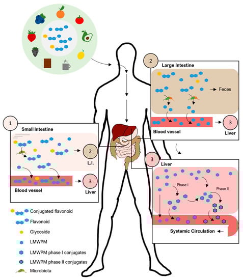 Diets rich in (poly)phenols originate large amounts of flavonoids and flavonoid conjugates reaching the digestive system. (1) In the small intestine, epithelial and bacterial enzymes remove sugar conjugates while absorption occurs. (2) The majority of flavonoids travel to the lower part of the gut where microbiota catabolizes flavonoids into LMWPM that will be absorbed into enterohepatic circulation. (3) LMWPM will enter systemic circulation intact or will undergo phase I and II metabolic reactions by intestinal and liver cells before reaching the circulation. LMWPM—low molecular weight (poly)phenol metabolites. L.I.—large intestine.