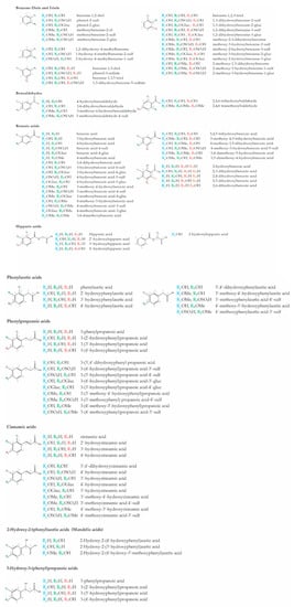 Chemical structures of low molecular weight (poly)phenol metabolites resulting from gut microbiota catabolism of flavonoids or enterohepatic phase I and II metabolic conversions. The nomenclature used followed recent recommendations [32]. Sulf—sulfate; Gluc—glucuronide; Me—methyl group.
