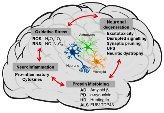 Main hallmarks of neurodegeneration and neurodegenerative diseases—protein misfolding, neuroinflammation, neuronal degeneration and oxidative stress—shared between the major cellular types present in the brain such as neurons, astrocytes and microglia. UPS: ubiquitin—proteosome system, ROS: reactive oxygen species, RNS: reactive nitrogen system, AD: Alzheimer’s disease, PD: Parkinson’s disease, HD: Huntington’s disease, ALS: amyotrophic lateral sclerosis.