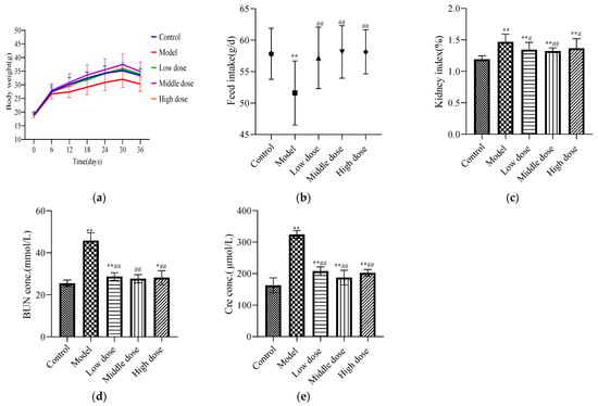 Pharmacodynamic evaluation index for LBP against lead-induced renal injury. The results are expressed as the mean ± SD. * Statistically significant compared to control group, * p < 0.05, ** p < 0.01. # Statistically significant compared to model group, # p < 0.05, ## p < 0.01. (a) Weight change of mice; (b) feed intake of mice; (c) renal index; (d) expression level of BUN; (e) expression level of Cre.