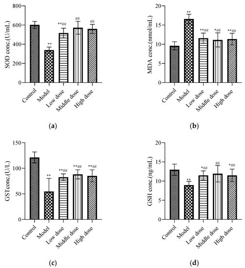 Effects of LBP on oxidative stress markers. The results are expressed as the mean ± SD, n = 10. * Statistically significant compared to control group, * p < 0.05, ** p < 0.01. # Statistically significant compared to model group, ## p < 0.01. (a) Expression of superoxide dismutase (SOD); (b) Expression of malondialdehyde (MDA); (c) Expression of glutathione S-transferase (GST); (d) Expression of glutathione (GSH).