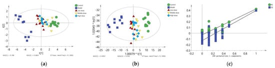 Results of multivariate statistical analysis. (a) Principal component analysis diagram; (b) Orthogonal partial least squares discriminant analysis diagram; (c) Verification diagram of orthogonal partial least squares discriminant analysis.