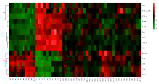 Clustering heatmap results. “n” indicates the number of mice, Kn the control group, Mn the model group, LD the low-dose group, MD the medium-dose group, and HD the high-dose group. Nitric oxide (NO); Tumor necrosis factor-α (TNF-α); Malondialdehyde (MDA); Interleukin-1β (IL-1β); Serum creatinine (Cre); Blood urea nitrogen (BUN); Caspase-3 (Casp-3); Superoxide dismutase (SOD); Glutathione S-transferase (GST); Glutathione (GSH).