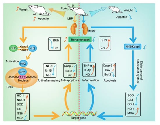 This study aimed to investigate the efficacy and mechanism of LBP against lead-induced renal injury. The results of the pharmacodynamics experiment showed that LBP could significantly restore the renal function and renal pathological damage of mice exposed to lead toxicity, as well as increasing the food intake of mice exposed to lead toxicity and promoting their growth. Dose effect results indicated that a medium dose of LBP was superior to high and low doses. The results of mechanistic experiments showed that LBP could attenuate oxidative stress, inflammation, and apoptosis in the kidneys of mice exposed to lead toxicity by activating the Nrf2 signaling pathway. The efficacy and mechanism of LBP against lead-induced renal injury are shown in Figure 9.