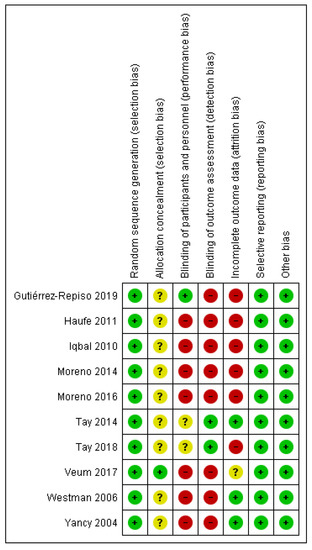 | Westman, 2006 [28] | Two-armed randomized trial | Sample: Intervention: 59 Control: 60 Mean age ± SD: Intervention: 44.4 ± 10.1 Control: 45.6 ± 9.0 Percentage of women: Intervention: 75% Control: 78% North Carolina, USA | Low-carbohydrate, ketogenic diet (initially <20 g of carbohydrates/day) plus nutritional supplements | Low-fat, low-calorie diet | 6 months | Unclear Dropout rate: 0.84% total dropout (not specified and cannot be deduced per group) However, the authors consider the initial and final sample to be the same number of participants. |