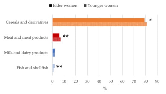 The main sources of vitamin B6 for women of childbearing (Figure 3) were meat and meat products, with a significantly higher contribution for the younger women group (28%) compared to older women (24%). Older women consumed a higher proportions of vegetables than younger women (16% vs. 13%). Cereals and derivatives ranked third (12%), and next were milk and dairy products (8%). All of these above groups contributed to nearly 60% of the vitamin B6 reported intake.