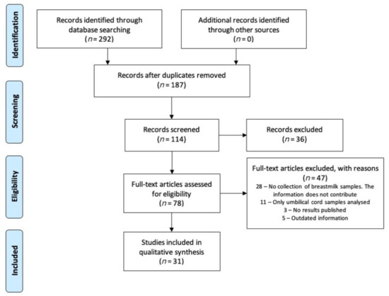 This systematic review was conducted in accordance with the criteria set forth in the Preferred Reporting Items for Systematic Reviews and Meta-Analysis (PRISMA) [52]. The literature search was carried out in PubMed and Web of Science. The search strategy combined the MeSH terms “COVID-19”, “SARS-CoV-2”, “breastfeeding”, “immune system”, “breastmilk”, and “vaccine”, combined with each other using Boolean operators. Articles less than 2 years old were selected (COVID-19 period), obtaining a total of 31 articles to review. The flowchart in Figure 1 details the screening and selection process. All articles were about COVID-19 and its possible impact on breastfeeding.