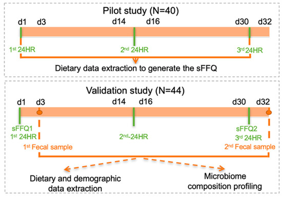 Study design. We first designed a pilot study to extract and quantify the dietary habits of our population. These data were then used to build a simplified food-frequency questionnaire (sFFQ). In the pilot study, participants were interviewed three times by trained staff members over a one-month period in a form of three dietary recalls (three 24HRs) (baseline, day 15, day 30), and in the validation study, they also underwent three 24HRs and were asked to complete two web-based sFFQs, one at baseline and the other a month later (first stool after completing each sFFQ). Participants provided a frozen stool sample on day 3 and day 32 for microbiome analysis.