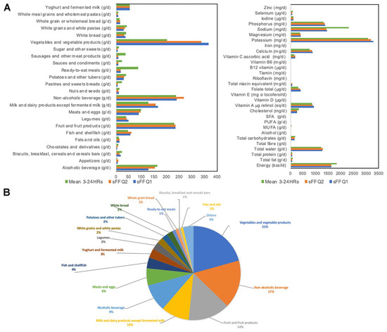 Participants’ dietary profile. (A) Food groups, energy, and nutrients extracted from the sFFQs and 24HRs. (B) Proportions of food groups as extracted from the sFFQ2 (validation study). Food groups with proportions lower than 1% were grouped into “Others”.