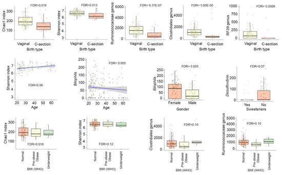 Vaginal birth was found to be associated with higher microbial diversity (FDR < 0.02 for Chao1 (richness) and Shannon (evenness) indices) and resulted in enrichment in several bacterial genera, including an unclassified genus from the Ruminococcaceae family (FDR = 6.37 × 10−7), from the Clostridiales order (FDR = 5.80 × 10−5) and from RF39 (FDR = 0.0006) as compared with C-section births (Figure 3). Age was found positively correlated with diversity (FDR = 0.06 for Shannon index) and negatively correlated with Bilophila (FDR = 0.005). The pre-obese and obese group (BMI above 25) was associated with a lower microbial diversity (FDR = 0.018 for Chao1 and FDR = 0.12 for Shannon) and depleted in members of the Clostridiales order, such as Facecalibacterium (FDR = 0.10). BMI was classified following the World Health Organization’s recommendation as follows: underweight (BMI below 18.5), normal weight (BMI = 18.5–24.9), pre-obesity (BMI = 25.0–29.9), and obesity (BMI above 30.0). Smoking habit (smoker, non-smoker, or ex-smoker) was not associated with diversity or any microbial taxon. Gender was not found associated with diversity but was associated with a depletion of Bilophila (FDR = 0.04) in male participants. Use of sweeteners was negatively associated with Desulfovibrio (FDR = 0.07).