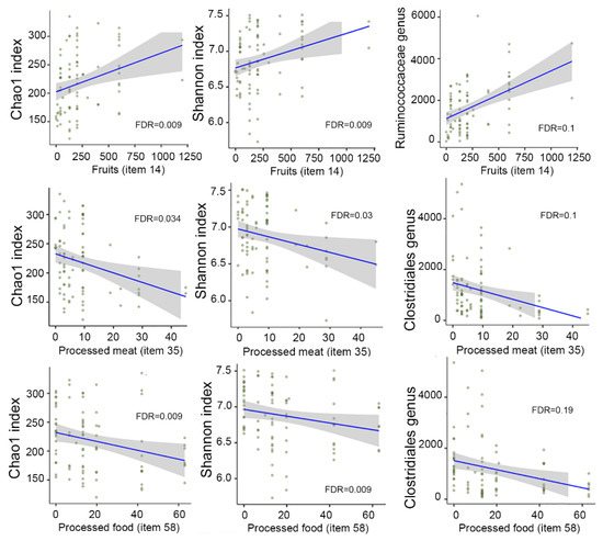 To correlate microbiome data with dietary intake, we first used the 58 food items from the sFFQs (n = 44, 85 faecal samples; one sample did not provide sufficient high-quality sequences, and two subjects provided only one sample at baseline). The analysis was performed using MaAsLin2. The results are shown in Figure 4. Item 14, which consisted of fresh fruit, was positively associated with richness and evenness (FDR = 0.009 for Chao1 and Shannon) and with the relative abundance of a member of the Ruminococcaceae family (FDR = 0.1). Item 35, which consists of processed meats, was negatively associated with richness (Chao1, FDR = 0.034), evenness (Shannon, FDR = 0.03), and an unclassified genus from the Clostridiales order (FDR = 0.1). Item 58, which comprised process foods, was negatively associated with richness and evenness (FDR = 0.009 for Chao1 and Shannon) and with an unclassified genus from the Clostridiales order (FDR = 0.19).