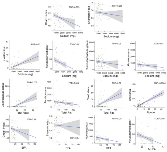 Finally, we did not uncover any association between the 29 nutrients and total energy extracted from the sFFQs and microbial diversity except for sodium (FDR = 0.005) (Figure 5) and saturated fatty acid (SFA) (FDR = 0.04) (Figure 5), whose levels were negatively correlated with both richness and evenness. Sodium was positively correlated with Holdemania and negatively correlated with Ruminococcus and Methanobrevicter, a member of the Ruminococcaceae family (FDR < 0.05). Other nutrients, such as alcohol, total fat, and total fibre, were also associated with several microbial genera (Figure 5). Alcohol was positively correlated with two genera from the Coriobacteriaceae family, one of them being Collinsella (FDR = 0.0004), and negatively correlated with a member of the Peptostreptococcaceae family (FDR = 0.03). Total fat and SFA were negatively correlated with Ruminococcus; total fat was also positively correlated with Clostridium. Monounsaturated fatty acids (MUFA) were negatively correlated with Methanobrevibacter (FDR = 0.03). Total fibre was positively correlated with a member of the Clostridiaceae family (FDR = 0.009).