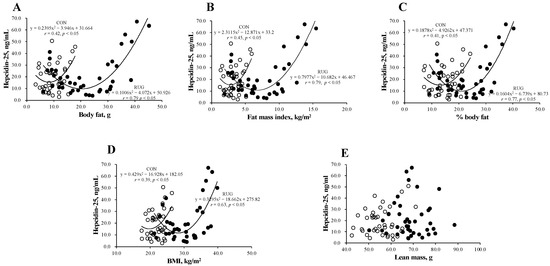 Figure 2 shows the relationship between hepcidin-25 and body composition in the RUG and CON groups. Interestingly, a U-shaped curve was observed between hepcidin-25 and body fat (Figure 2A), fat mass index (Figure 2B), body fat percentage (Figure 2C), and BMI (Figure 2D) in both groups. However, this relationship was not observed between hepcidin-25 and lean mass (Figure 2E). The correlations between the level of hepcidin-25 and the amount of body fat (r = 0.79 vs. r = 0.42; p < 0.05), fat mass index (r = 0.79 vs. r = 0.45, p < 0.05), body fat percentage (r = 0.77 vs. r = 0.41; p < 0.05), and BMI (r = 0.39 vs. r = 0.69; p = 0.15) were either significant or tended toward significance in the RUG group but not in the CON group. Our data suggest that athletes who either had a higher body fat mass or lower body fat mass had higher hepcidin-25 levels. To estimate the optimal range of body fat that sustains hepcidin level, we substituted the average hepcidin-25 level (21.3 ng/mL) into the formula of a quadratic function. As a result, the body fat (16.2–24.2 kg), fat mass index (3.1–10.3 kg/m2), %body fat (12.6–29.4%), and BMI (22.9–33.8 kg/m2) were suggested as optimal ranges in the RUG group. It is known that obesity increases hepcidin levels, which may be due to inflammation [22,23,24]. However, a lower body fat mass group with a higher hepcidin-25 level in athlete is new information.
