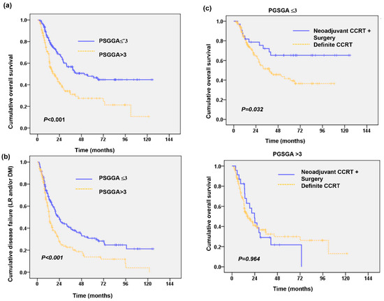 Of these 340 patients, after neoadjuvant CCRT, 155 (45%) had improved nutritional status (decrease in the post-Tx PGSGA score), 97 (29%) had deteriorated nutrition status (increase in the post-Tx PGSGA score), and the other 88 patients had no change in the PGSGA score compared to pre-Tx PGSGA score (Table 5). As shown in Figure S1a, the improvement of nutritional status after neoadjuvant CCRT was significantly associated with longer survival times in malnourished patients at diagnosis. More importantly, we found that surgical resection significantly prolonged the survival time of patients in the low Pre-Tx PGSGA group and of those without deterioration in nutritional status during treatment (p = 0.004), but not of those in the high Pre-Tx PGSGA group or with a deteriorated PGSGA score after neoadjuvant CCRT (Figure S1b). After IPTW adjustment (Table S1), the analyses showed that low post-Tx PGSGA was associated with better OS and lower risk developing loco-regional recurrence and distance metastasis (Table 6).