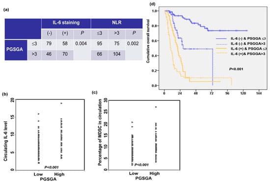 Various factors may determine immune responsiveness in cancer 18. The IL-6 and NLR, immunologically based index [], were associated with immune evasion and nutrition metabolism in cancer. MDSCs, a population of cells with suppressive activity and measured as CD11b + CD33 + HLA–DR− cells [], contribute to the negative regulation of immune responses that occur in cancer. We previously reported that IL-6-mediated induction of MDSCs was associated with esophageal tumor promotion and poor prognosis, and the NLR was related to the IL-6 and MDSC level. In the present study, we examined whether nutritional status was correlated with these immunologic markers in esophageal-SCC patients. Figure 2a–c shows that the Pre-Tx PGSGA score was significantly correlated to the expression levels of IL-6 in tumor specimens, and the levels of NLR, IL-6 and the percentage of MDSCs in circulation. Furthermore, by survival analyses, positive staining of IL-6 and a high Pre-Tx PGSGA score were associated with reduced OS time (Figure 2d). Based on the results, we suggest that a high Pre-Tx PGSGA score was associated with a tumor-promoting immune response, which plays a role in predicting a poor prognosis in esophageal-SCC.