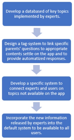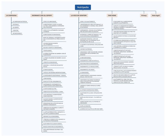 | Informati con gli esperti (The Expert voices) | Scientific, evidence-based information expanded with articles and contents delivered by the experts and focused on the main nutritional topics related to pregnancy, breastfeeding, first 1000 days of life, and early parenthood. Practical strategies and solutions, advice and example were also included (e.g., foods for adequate infant breakfast or weaning menus). |