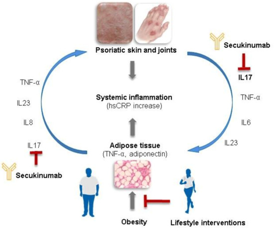 Pathophysiology of psoriasis and obesity. The pathophysiological processes of systemic inflammation that underlie psoriasis and obesity/metabolic syndrome are interconnected via the release of inflammatory mediators from both psoriatic lesions and adipose tissue. IL-17 blockade with secukinumab inhibits aspects of this inflammatory cycle, but lifestyle interventions aimed at reducing obesity and associated inflammation may produce synergistic effects.hsCrp, high-sensitivity C-reactive protein; IL, interleukin; TNF, tumour necrosis factor.