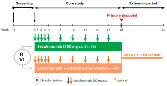 Patients were randomized 1:1 to one of two treatment arms in the core study. Patients in arm A will receive secukinumab 300 mg (approved dose; weekly from weeks 0 to 4 then at 4-weekly interval) from week 0 until week 24. Patients in arm B will receive secukinumab 300 mg from week 0 until week 24 and, in addition, participate in a concomitant lifestyle intervention program (Figure 2). Following week 28, there will be an extension period to week 56 where all patients may participate in the lifestyle intervention program (Figure 2), in conjunction with any psoriasis therapy as deemed appropriate by the treating physician. The purpose of this is to collect long-term data up to one year and offer the lifestyle intervention to all patients.