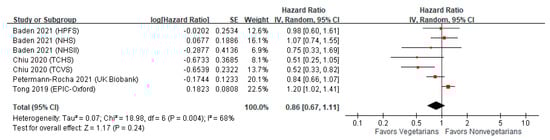 A total of seven studies (including 408 total stroke cases in 29,705 vegetarians and 13,026 total stroke cases in 627,728 nonvegetarians) reported the adjusted HRs of total stroke among vegetarians compared with nonvegetarians [14,15,16,24]. The meta-analysis showed that there was no significant association between vegetarian dietary patterns and the risk of incident stroke (HR = 0.86; 95% CI = 0.67–1.11; I2 = 68%, n = 7; Figure 1).