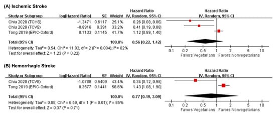 A total of three studies (including 128 ischemic stroke cases in 54,034 participants) reported the adjusted HRs of ischemic stroke, while two studies (including 93 hemorrhagic stroke cases in 48,984 participants) reported that of hemorrhagic stroke comparing vegetarians with nonvegetarians. As shown in Figure 2, there was no significant association between vegetarian diets and the risk of ischemic stroke (HR = 0.56; 95% CI = 0.22–1.42; I2 = 82%, n = 3) or hemorrhagic stroke (HR = 0.77; 95% CI = 0.19–3.09; I2 = 85%, n = 2).