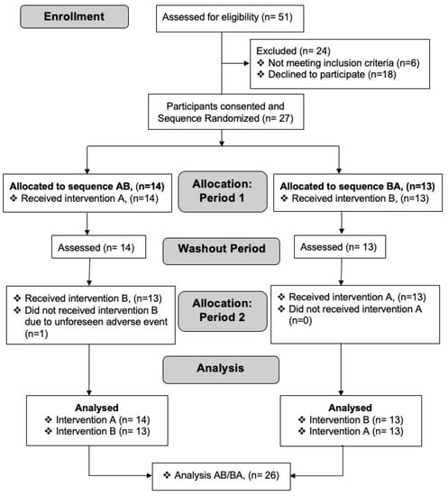 A CONSORT (Consolidated Standards of Reporting Trials) diagram depicting the process of recruitment, selection, randomization and analysis of participants. Due to an unforeseen adverse event (lactose intolerance), one participant (n = 1) did not perform intervention B during period 2 of allocation and thus was excluded in the analysis of intervention B.