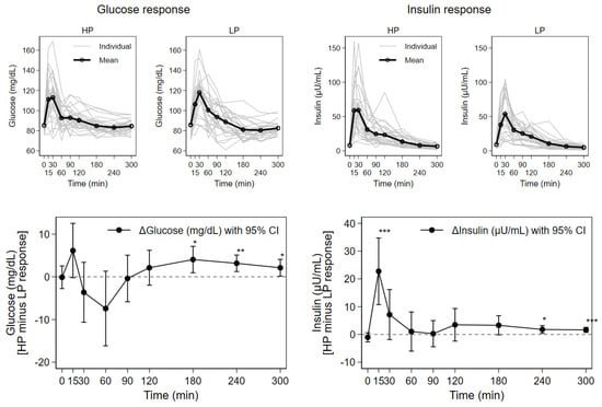 Response of serum concentrations of glucose and insulin after consumption of higher (HP) and lower protein (LP) test meals over time for 27 subjects; mean with individual concentration curves by test meal as well as mean individual difference (HP minus LP) with 95% CI (* p < 0.05, ** p < 0.01, *** p < 0.001).