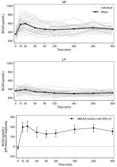 Both plasma BCAA AUCs and their concentration maximums were significantly higher after the intake of HP compared to LP; HP curves were characterized by steep initial increases directly after milk consumption. Significantly greater BCAA concentrations at all postprandial points were observed after HP. Approximately 37%, 83% and 87% higher concentration maximums were observed for the BCAAs valine, leucine and isoleucine, respectively. BCAAs showed a 49% higher AUC and 61% higher concentration maximums after HP compared to LP.