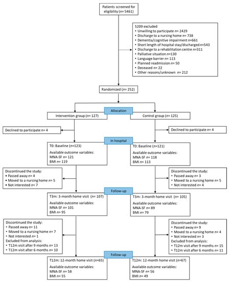 Of 5461 screened patients, 252 patients agreed to participate and were randomized. A total of 127 patients were allocated to IG and 125 patients to CG. Four patients in each group withdrew consent within 14 days after signing. Thus, 244 individuals continued the participation. During the first three months, 28 participants discontinued the study. From T3m until T12m, another 35 participants dropped out from the study. Participants’ reasons for withdrawal, the number of excluded participants due to the fact that the final visits were after nine and six months, and the number of available MNA-SF, as well as BMI values at each time point are shown in Figure 1.