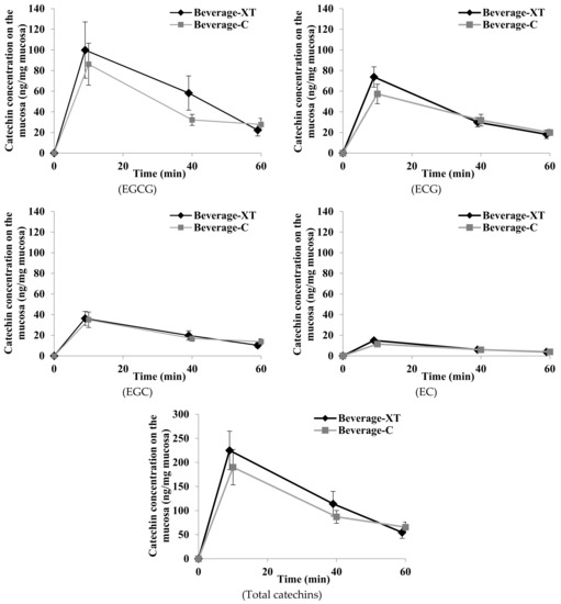 The trials were performed from 22 August to 26 September 2019. All enrolled subjects participated in two interventional trials, consumption of a catechin-containing beverage (beverage-C) in the first trial and consumption of a catechin-containing beverage with xanthan gum (beverage-XT) in the second trial. Figure 1 shows the outline of the trial; all subjects were required to complete both sessions with the different test beverages. The two trials were performed under the same condition. In general, after participation was permitted by a medical doctor, participants were seated and asked to rest 10 min. Next, the oral mucosa of the inner cheek was collected and measured as a control value using a FLOQ swab (Copan Flock Technologies Srl, Brescia, Italy) after a physical examination by a medical doctor. The subject rested 10 min again, then consumed a 40 mL beverage (beverage-C or beverage-XT), and oral mucosa samples were collected with an FLOQ swab 10, 40, and 60 min after drinking. To collect mucosa from a defined area, a FLOQ swab was twisted five times while fixed to the mucosa inside the cheek. At least one week after the first trial, the second trial with the second test beverages was conducted with similar procedures. The locations of the mucus or mucosa collection at each time-point did not overlap. The amount of mucosa collected was calculated by subtracting the weight of the initial FLOQ swab from the weight of the FLOQ swab used to collect the mucus. The FLOQ swab with the collected mucosa was immersed in 200 μL of PBS containing 20 μL of 0.2% ascorbic acid, vortexed, and then the solution was dispensed into another tube and stored at −80 °C until the catechin content was determined. Food intake, strenuous exercise, smoking, alcohol intake, and health foods and supplements containing tea ingredients were prohibited after 21:00 the day before the trial.