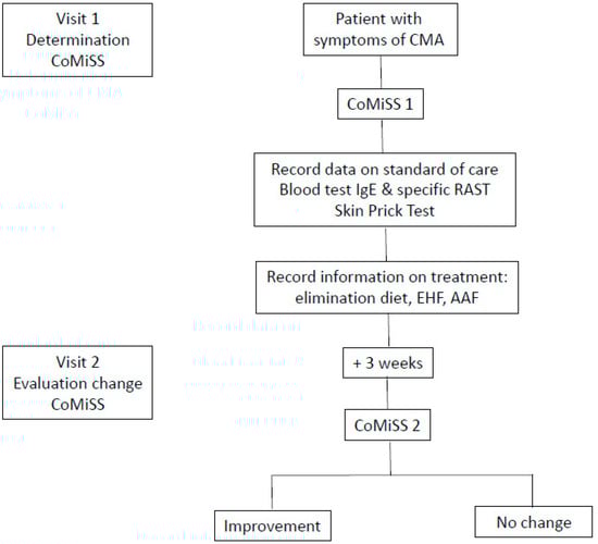 The CoMiSS score was determined by the HCP during both visits using the CoMiSS awareness tool form. At baseline, basic information such as date of birth, sex, weight, length and head circumference were recorded, as well as the history of CMA-related symptoms, such as duration of symptoms and diet at baseline. The dietary and medical intervention recommended by the HCP was registered. Information was also recorded regarding the requests of HCPs for investigations such as blood sampling and skin prick testing for diagnostic purposes.