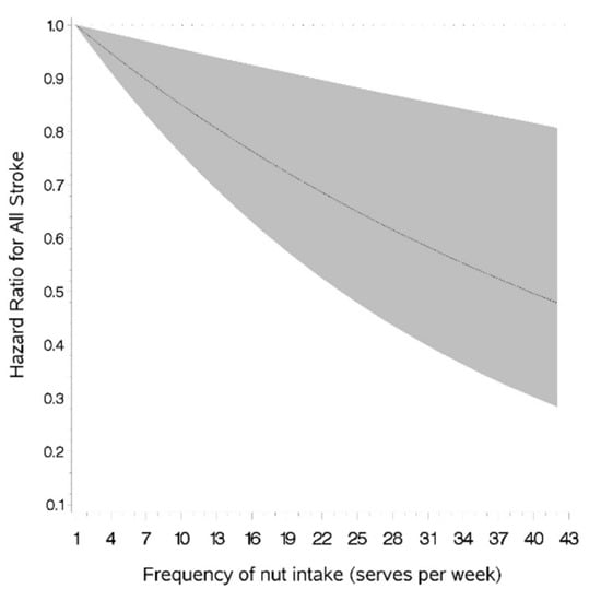 In order to visualize the shape of association between nut intake and stroke risk, we fitted restricted cubic splines to the proportional hazards regression models to examine non-parametrically the relation of nut intake with the likelihood of having a stroke [14]. All analyses were conducted using SAS Enterprise Guide 7.1, and the level of significance was set at p-value < 0.05.
