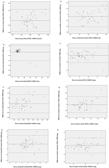 FFQs have to be validated, usually with 24-h dietary recalls [23,24,25] or biochemical parameters [26] in order to avoid errors and biases. The validity of the FFQ must be evaluated using several measures and statistical methods. The most commonly used method is the correlation coefficient, though this is not a measure of agreement but instead a measure of association that can be partly influenced by the size of the sample. The Bland-Altman method is also a good method to assess the level of agreement between different methods of measurement. Most epidemiological studies use more than one statistical approach to demonstrate the robustness of the validation and reproducibility process [27,28].